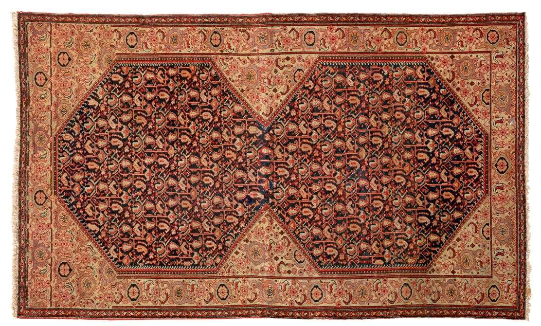 Très fin Melayer (Perse) fin XIXe début XXe siècle. Velours en laine d'agneau soyeuse de qualité sur fondations en coton. Densité d'environ 9 000 noeuds au dm2. Remarquable finesse. Bon état général. À décor de doublemédaillons octogonaux bleu nuit incrustés de mille botehs ivoire et vieux rose (symbole de la genèse et de la fécondité, motif de la graine que l'on retrouve dans les châles cachemires) stylisés en forme de diamants éclatés, sur contre-fond beige à original décor de semis de bulbes floraux en forme de carapaces de tortues stylisées géométriquement incrustées de pétales floraux. Fine bordure à semis de boutons floraux.