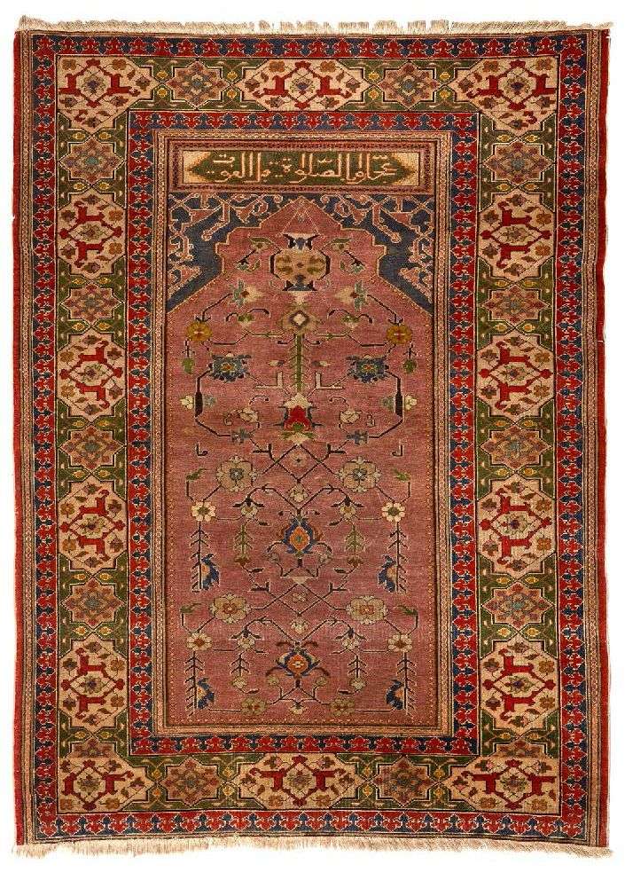 Très fin et original Panderma (Asie mineure, Turquie) fin XIXe début XXe siècle. Tapis de forme prière. Velours en laine soyeuse de qualité sur fondations en coton. Densité d'environ 9 000 noeuds au dm2. Remarquable finesse.Champ vieux rose à mihrab en forme de couronne orné d'une lampe à huile suspendue, et à décor de composition de branchages de bulbes, boutons de fleurs et feuillages stylisés en symétrie. Bordure vert émeraude à inscriptions poétiques. Cinq bordures dont la principale vert bronze à semis de cartouches ivoire incrustées de caissons crénelés en forme de carapaces de tortues.