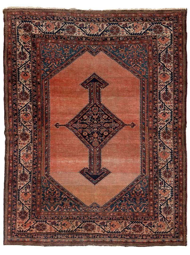 Très fin Melayer (Iran) vers 1910/1920. Velours en laine soyeuse de qualité sur fondations en coton. Densité d'environ 9 000 noeuds au dm2. Oxydations et usures naturelles. Champ vieux rose abrashé (mot turc, changement naturel de la laine) orné d'un large médaillon floral cruciforme bleu nuit incrusté de motifs dit Herati, et entouré de deux flèches de chasseurs stylisées. Quatre écoinçons vert paon à semis de bulbes et boutons floraux entourés de bandelettes stylisées. Six bordures dont la principale ivoire à entrelacs de branchages en torsades de palmettes fleuries entourées de feuillages.