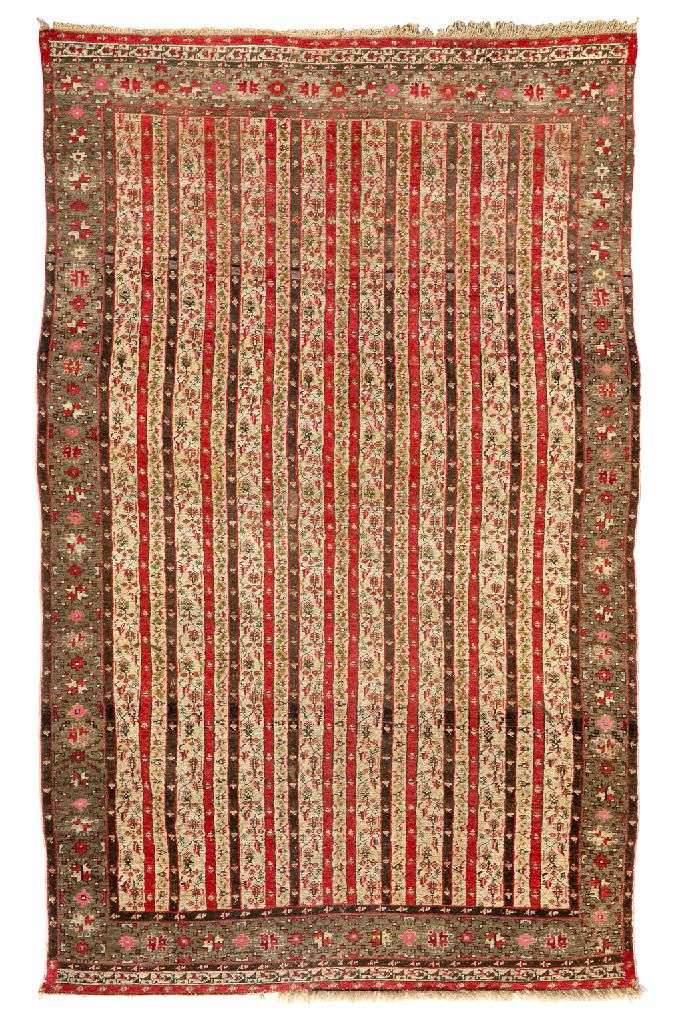 Original et très fin Konya (Anatolie centrale, Turquie) vers 1920. Velours en laine sur fondations en laine. Bon état général. Légères oxydations naturelles. Décor Bayadère : à bandes et rayures tabac et rubis incrustées de mille fleurs en forme de diamants éclatés stylisés. Quatre bordures dont la principale tabac à semis de bulbes et boutons floraux polychromes.