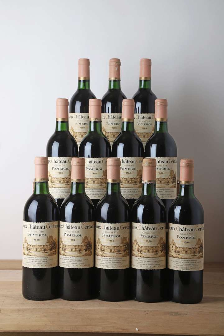 12 B VIEUX CHÂTEAU CERTAN (Caisse Bois d'origine abimée) (11 T.L.B. ou mieux| 1 H.E| 6 e.t.h| 6 c.c. dont 5 c.a. bas de jupes) - 1989 - Pomerol