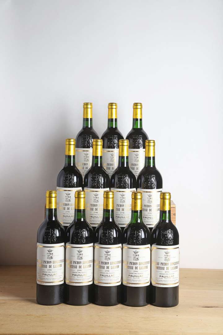12 B CHÂTEAU PICHON COMTESSE DE LALANDE (Caisse Bois d'origine) (2 B.G.+ et 1 H.E.+) - 1990 - GCC2 Pauillac