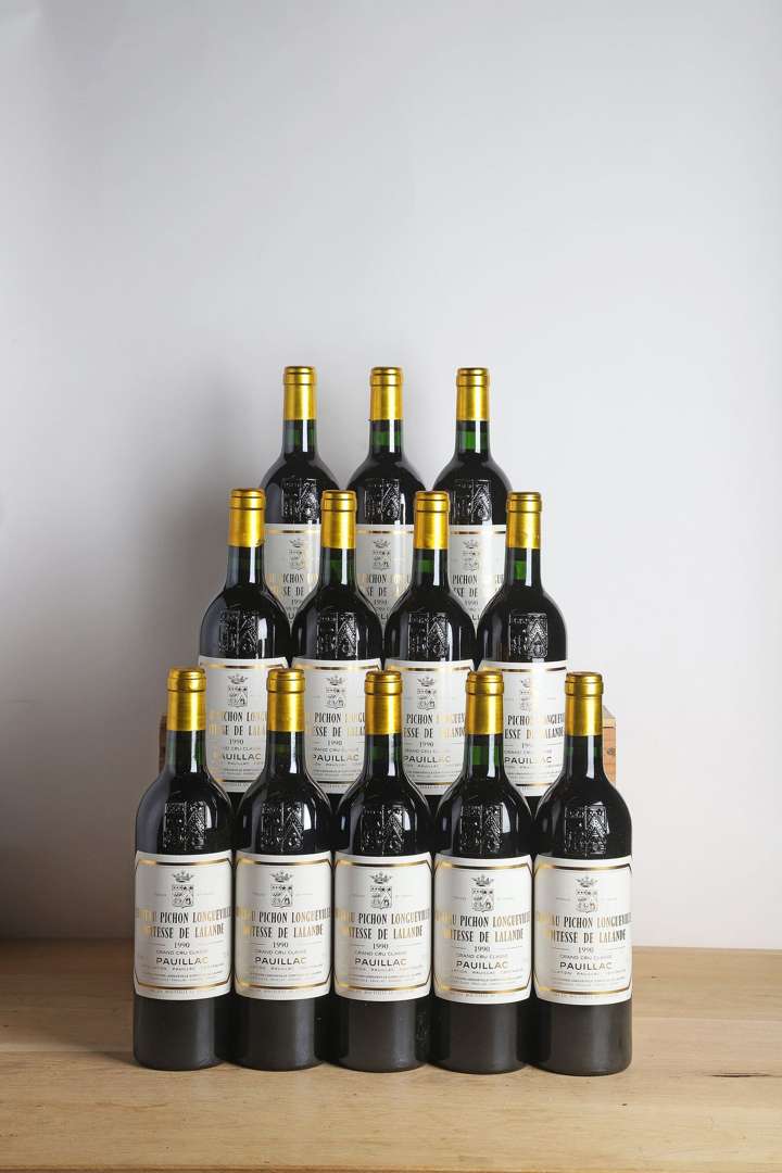 12 B CHÂTEAU PICHON COMTESSE DE LALANDE (Caisse Bois d'origine légèrement abimée) (1 B.G.+| 1 e.l.a| 4 bas de capsules légèrement abimés par frottements guittotines) - 1990 - GCC2 Pauillac