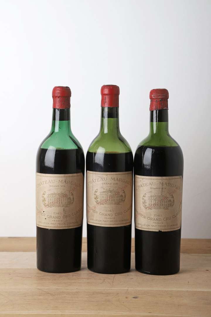 3 B CHÂTEAU MARGAUX (1 M.E| 1 B.E.+| 1 B.E| e.t.h. dont 2 e.a| c.s. dont 1 incisée au sommet et 1 abimée bas de jupe) - 1943 - GCC1 Margaux