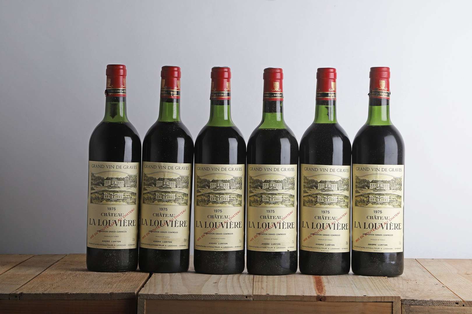 6 B CHÂTEAU LA LOUVIÈRE Rouge (Caisse Bois d'origine) (2 T.L.B| 3 H.E.+ et 1 H.E| 3 e.t.h. légères| 2 bouchons engagés fragiles) - 1975 - Pessac-Léognan