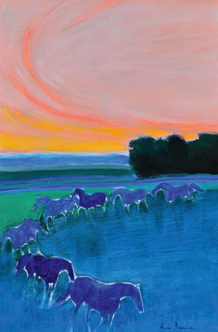 Leurs corps se fondent en un ensemble ornemental, deviennent des incarnations de l'" élan vital " et se transforment en symboles de noble élégance et de liberté cultivée. Là réapparaît le mythe séculaire du cheval et son cavalier, le cheval en tant que couronnement d'une nature ennoblie par l'homme. Dans leur forme hautement symbolique, réduite au plus petit commun dénominateur pictural, ils parviennent à engendrer des images intérieures et à réveiller des souvenirs. Ce sont moins les géniales images instantanées, enchantées par le mouvement d'Edgar Degas que rappellent les peintures de Brasilier | elles font plutôt penser au motif ancien du dresseur de chevaux, un Nestor par exemple, qu'Homère fait apparaître dans le troisième chant de son Odyssée, ou bien à des chevaux dont la représentation fait grande impression : les chevaux de Marly ou les coursiers de San Marco.»
