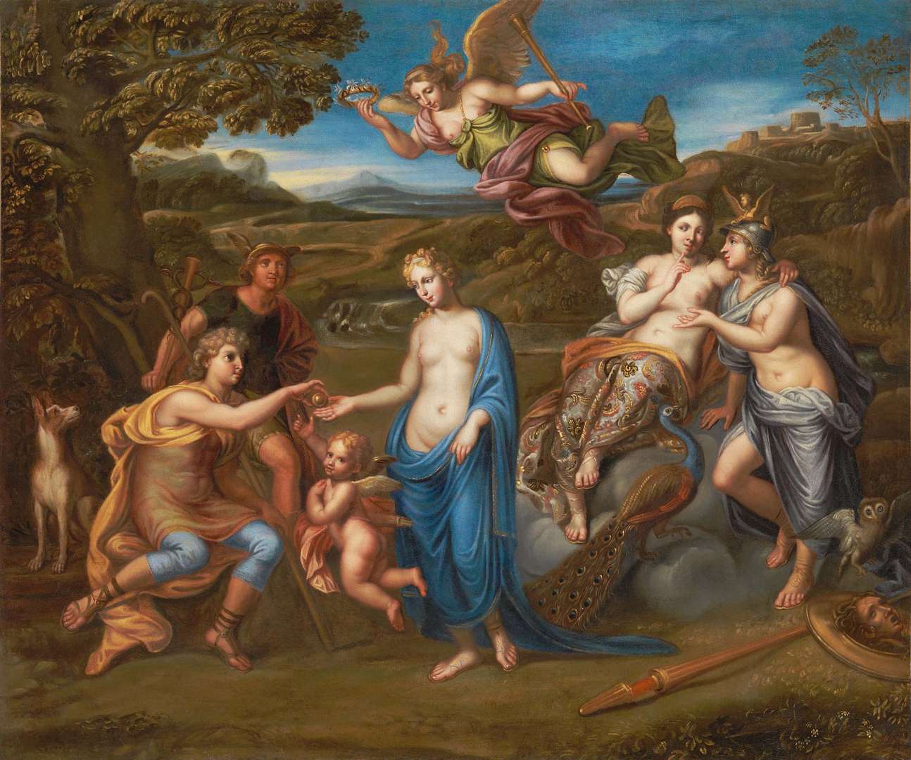 I ssu d’une dynastie d’artistes, élève de Charles Le Brun (1619 - 1690) et Pierre Mignard (1612 - 1695), Michel II Corneille, dit aussi Corneille le Jeune, poursuit son apprentissage en Italie entre 1659 et 1663, avant de rentrer à Paris et d’être reçu à l’Académie en 1663. Marqué par l’art de ses maîtres français, il vouait également une véritable admiration à Raphaël et aux Carrache, dans l’académie desquels il séjourna un temps. Cette double influence franco-italienne est perceptible dans la composition que nous présentons. Selon ce qu’il a pu voir à Bologne, la scène prend place sur fond de paysage classique, assez rigoureusement construit: il se structure en différents plans alternant cours d’eau, collines, architecture d’une ville lointaine et horizon. S’il le laisse relativement inanimé, il concentre le dynamisme de l’ensemble dans la scène du premier plan. Cet ensemble, disposé frontalement, n’est pas sans rappeler les compositions de Nicolas Poussin (1594 - 1665) que le peintre a pu également observer à Rome. La palette, déclinant couleurs vives et nuances précieuses, trahit l’influence de ses maîtres français. Maintes fois relatée par les auteurs antiques qui en donnent diverses versions, l’histoire du Jugement de Pâris sera le point de départ de la Guerre de Troie. Épisode emblématique de la mythologie grecque, il a de même été traité régulièrement par les artistes de toutes disciplines. Corneille le Jeune choisit ici l’instant fatidique où Pâris, ayant désigné Aphrodite comme la plus belle des déesses, lui remet l’une des pommes d’or du jardin des Hespérides. Son geste malheureux, accompagné par Cupidon et bientôt couronné par la Victoire, est déjà cruellement condamné par les deux concurrentes délaissées dont la vengeance ne saura tarder.