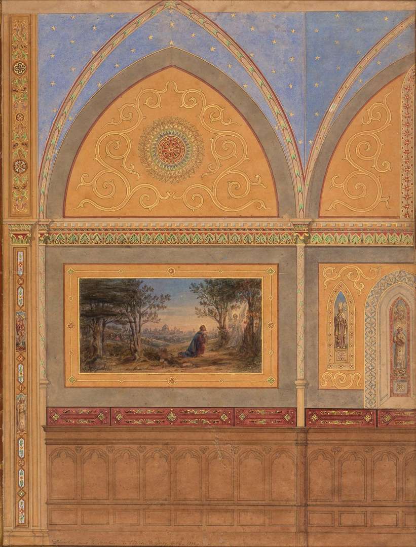 L’étude de la vie d’Étienne Raffort n’est pas chose aisée. Son effacement progressif des mémoires et le relatif silence des archives à son sujet font que l’existence de ce peintre né à Chalon en 1802 se teinte d’éléments relevant plus du fantasme que de l’exactitude historique. L’artiste fut apprécié de son vivant. Le Dr Loydreau, dans une étude datée de 1865 de la chapelle funéraire de Lugdivine de Montlaville à Chardonnay, ne le présente-t-il pas comme « l’un des enfants les plus chers de Chalon » avant de conclure ainsi : « Jamais pinceau, jamais talent n’ont été mis avec autant de désintéressement au service d’une plus noble et plus sainte cause » ? Artiste que l’on veut touche-à-tout et surtout voyageur, données corroborées au regard de sa production artistique, on l’a dit apprenti tonnelier parti de rien ayant voyagé en Algérie, Italie ou encore au Proche-Orient. Le musée Denon de Chalon-sur-Saône conserve plusieurs toiles de l’artiste confirmant ces pérégrinations exotiques, et dont la palette n’est pas sans évoquer l’art de Félix Ziem (Fig. 1). Ce système d’influence qui ne dit pas son nom entre Raffort et Ziem, de vingt ans son cadet, né à Beaune en 1821, fut au centre de la seule exposition consacrée au maître chalonnais, en 1980 au musée Denon, pour le centenaire de sa mort. Le catalogue, sommaire, précise d’emblée qu’il serait bien trop imprudent de dire que Félix Ziem doit sa manière à la peinture d’Étienne Raffort. Force est de constater, cependant, que les dates et la proximité géographique des deux artistes peuvent laisser sous-entendre au moins un regard du jeune Ziem sur la production de son voisin chalonnais. Concernant la question d’un Raffort ayant voyagé sans le sou, André Laurencin dans le livret de l’exposition de 1980 précise que déjà dans les années 1820 - 30, de tels voyages nécessitaient de solides revenus. De même, le peintre, qui réside alors à Paris avec son épouse PaulineEulalie, fait édifier en 1836, avant même ses quarante ans, une imposante masure à Raconnay, aux portes de Gergy – commune au nord de Chalon-sur-Saône –, d’après la tradition locale sur les plans de son ami Viollet-le-Duc. Il expose au Salon à partir de 1833 et jusqu’en 1857, où il obtient une médaille de 3 e classe en 1838, de 2 e classe en 1840, de 1re en 1843 pour une toile mettant en scène l’Entrée d’Henri III à Venise en 1574 – tableau aujourd’hui conservé au musée de Grenoble. Il convient ici de préciser que très peu de compositions du peintre sont conservées en contexte muséal. Outre les musées de Chalon-sur-Saône et de Grenoble, la plupart de ses réalisations se trouvent aujourd’hui en main privée. Parallèlement à son activité artistique, il devient maire de Gergy en 1856 et le reste jusqu’en 1870, moment où il se retire de la vie publique pour s’éteindre dix ans plus tard, en 1880. C’est précisément durant ces mandats successifs qu’il réalise le décor peint du chœur de l’église Saint-Germain du village, entre 1866 et 1869. La réalisation de ce décor, s’étalant sur quatre ans et déployant divers ornements, figures de saints et deux scènes narratives mettant en scène La Fuite en Égypte (Fig. 2) et la Prière du Christ au jardin des Oliviers (Fig. 3), nécessita plusieurs études. Une première, préparant la scène de la Fuite en Égypte, est réapparue en décembre 2020 (Fig. 4). L’aquarelle de 57 x 32 cm a depuis été acquise par la commune de Gergy. Celle-ci ne prépare que la scène narrative et non le décor global du pan de mur. (Voir suite dans le catalogue)