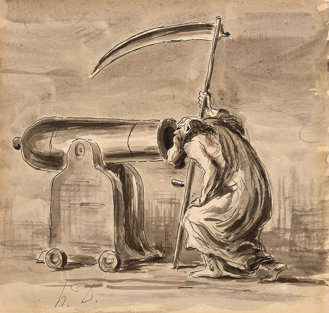 Il existe une gravure, dans le sens inverse de notre dessin, publiée par Daumier dans le journal Le Charivari pour lequel il travaillait. Il est probable que notre composition ait été préparatoire à cette gravure.