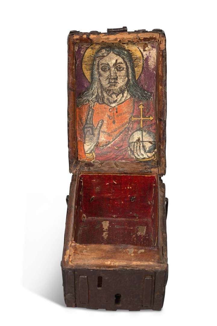 PETIT COFFRET À LIVRE D'HEURE En cuir et âme de bois, pentures de fers, couvercle à charnière et serrure à moraillon. Attaches métalliques latérales. Il dévoile sous l'abattant une rare estampe, produite d'un bois gravé au sujet d'un Christ Salvator Mundi : épreuve coloriée, en jaune, rouge et orangé sur fond lie de vin (60 x 100 mm, usures, petits accidents). À noter que cette estampe, probablement unique, ne figure ni dans Schreiber, ni dans The Illustrated Bartsch.