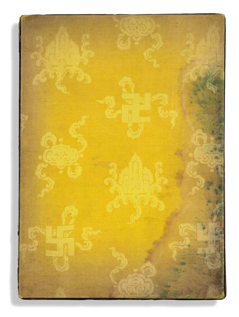 La couverture et le dos sont en bois, recouvert d'un tissu de soie jaune à décor de svastika et rochers parmi les vagues.
