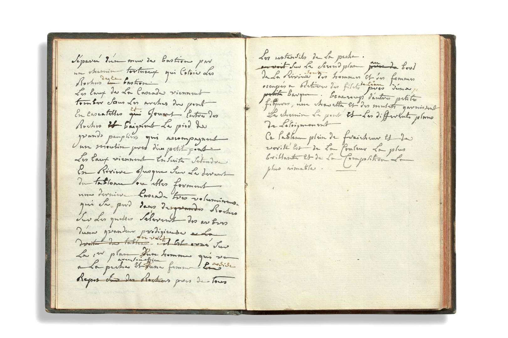 Carnet de dessins contenant la description manuscrite et les croquis des tableaux de Joseph Vernet pour le comte de Laborde (1797), l'inventaire manuscrit des tableaux de la collection d'Hubert Robert (1805), le livre de comptes d'un séjour en Lorraine (1807) et divers croquis de figures et monuments