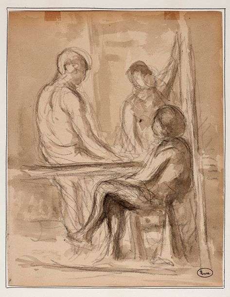 Lavis brun sur traits de crayon, signé en bas à gauche et marqué du cachet en bas à droite