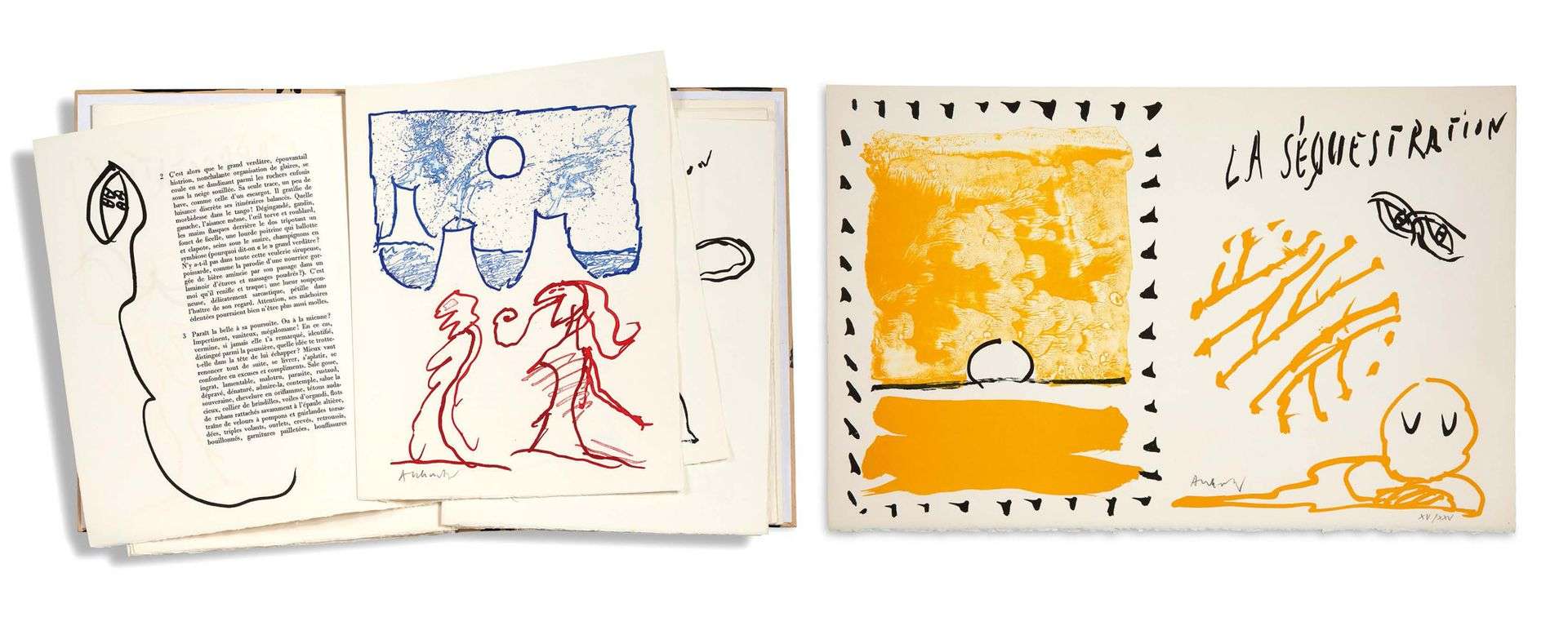 Avec une grande suite d'estampes numérotées XV/XXV et signées : 5 eaux-fortes en noir, 16 lithographies inédites en couleur sous étui orné 53,5 x 68 cm