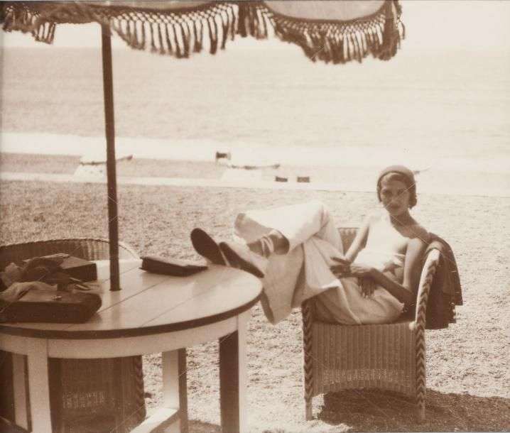 Tirage argentique d'époque annoté au verso par la main de Lartigue au crayon « D75 », représentant Renée Perle dans la chambre d'amour à Biarritz.