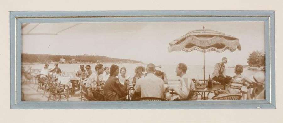 Tirage argentique d'époque légendé au verso par la main de Lartigue au crayon « L15 », représentant de nombreux personnages attablés en terrasse en bord de mer à Juan-les-Pins.
