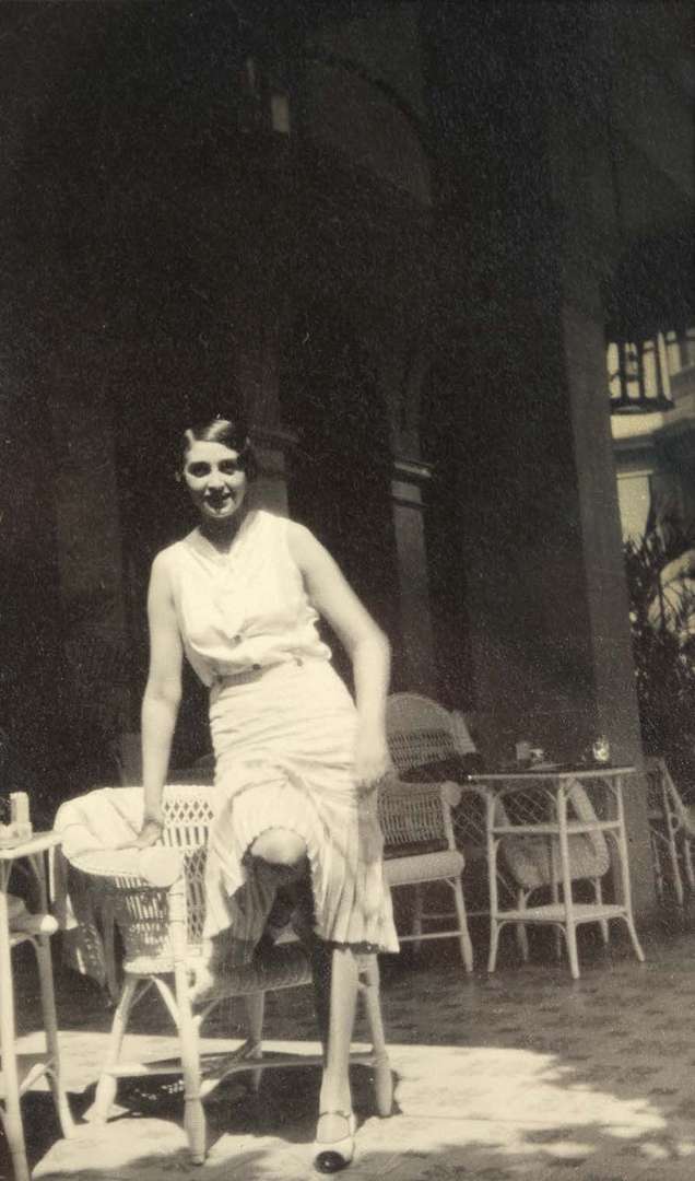 « Renée à la terrasse », photographie originale [Circa 1930 - 1932], tirage argentique, 11,1 x 6,7 cm, sous encadrement.