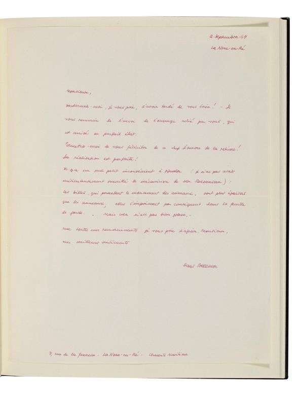 5 L.A.S. «Hans Bellmer», 1964 - 1968, au relieur Jean-Paul MIGUET, et 3 maquettes de reliure avec notes autographes | 8 pages in-4 et in-8, certaines à l'encre rouge et sur papier rose, enveloppes, le tout monté sur onglets sur feuillets de papier vergé et relié en un volume in-4 à encadrement veau noir, plats microbois noir, gardes de papier uni rose, titre au palladium, étui (C. et J.P. Miguet).