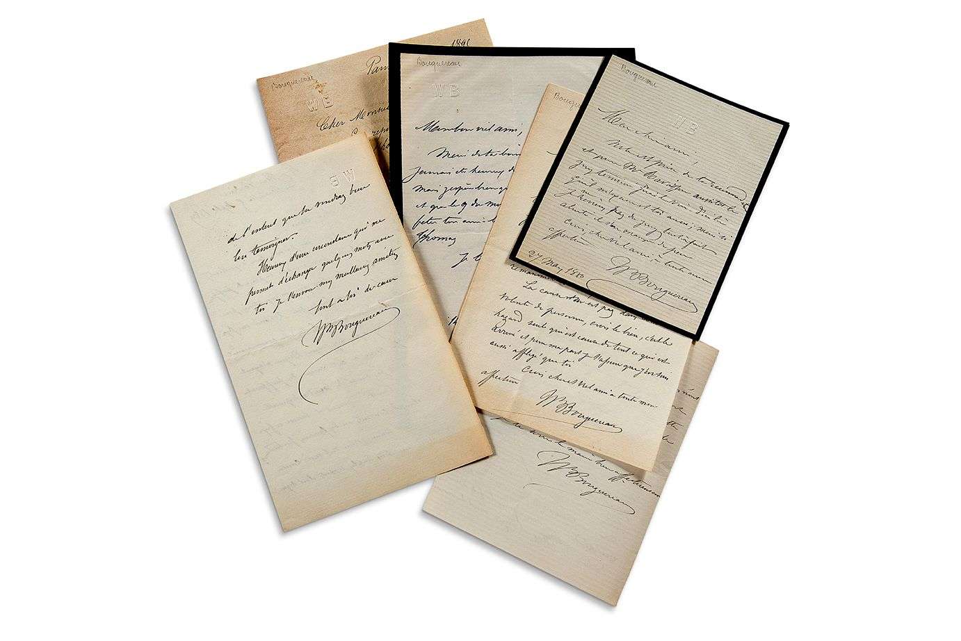 6 L.A.S., «Wm Bouguereau» Paris et La Rochelle 1875 - 1895, à un ami | 10 pages in-8 ou in-12, la plupart à son chiffre. 6 décembre 1895. À son avis, «l'étude des anciens maîtres et l'étude de la nature, l'une et l'autre indispensables pour l'éducation d'un artiste, ne demandent pas à être dirigées par les mêmes moyens»... Il commente longuement le Prix de Rome et les études à la Villa Médicis... «Quant à l'étude de la Nature dans ses phases infimes, étude qui depuis son début jusqu'à la fin de sa carrière, est la passion de chaque artiste digne de ce nom, c'est le tempérament de l'homme qui indique dans quel pays il doit la poursuivre»...