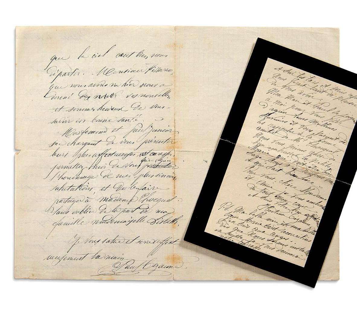 L.A.S. «Paul Cézanne», Pontoise 16 mai 1881, à Victor CHOCQUET | 2 pages in-8 (fentes aux plis réparées). [Victor CHOCQUET (1821 - 1891) fut un ami et collectionneur des impressionnistes. Il fut un fervent amateur de Cézanne, dont il avait découvert les tableaux chez le Père Tanguy, et qui fit son portrait.] «Ayant appris que la toile de 40 que Monsieur TANGUY a dû vous remettre ne possédait pas son cadre, je vous serai très-obligé, si vous le voulez bien, de faire porter chez vous la bordure du susdit tableau»... Il s'excuse de ce nouveau dérangement. Il ajoute : «nous sommes tous en bon état, et depuis notre arrivée, nous jouissons de toutes les variabilités athmosphériques que le ciel veut bien nous départir. Monsieur PISSARRO, que nous avons vu hier, nous a donné de vos nouvelles»... Sa femme et «Paul Junior» lui présentent «leurs plus affectueuses caresses»...