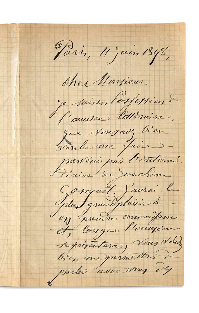 L.A.S. «Paul Cezanne», Paris 11 juin 1898, à Eugène MONTFORT | 1 page et demie in-8, enveloppe. [Eugène MONTFORT (1877 - 1936), jeune poète et critique d'art, fut présenté à Cézanne par Joachim Gasquet | en 1903, il va fonder la revue Les Marges. Il venait alors de publier son second recueil, Chair.] «Je suis en possession de l'oeuvre littéraire que vous avez bien voulu me faire parvenir par l'intermédiaire de Joachim Gasquet. J'aurai le plus grand plaisir à en prendre connaissance et lorsque l'occasion se présentera, vous voudrez bien me permettre de parler avec vous des choses de l'Art qui nous intéressent tant»...