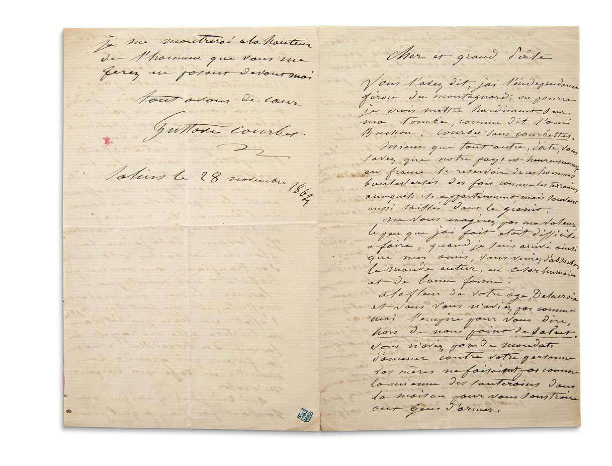 Magnifique lettre sur sa peinture et les persécutions contre son art. «Cher et grand Poète Vous l'avez dit, j'ai l'indépendance féroce du montagnard» | et on pourra graver sur sa tombe, comme dit Buchon : «Courbet sans courbettes. Mieux que tout autre, Poète, vous savez que notre pays est heureusement en France le réservoir de ces hommes bouleversés des fois comme les terrains auxquels ils appartiennent, mais souvent aussi taillés dans le granit».