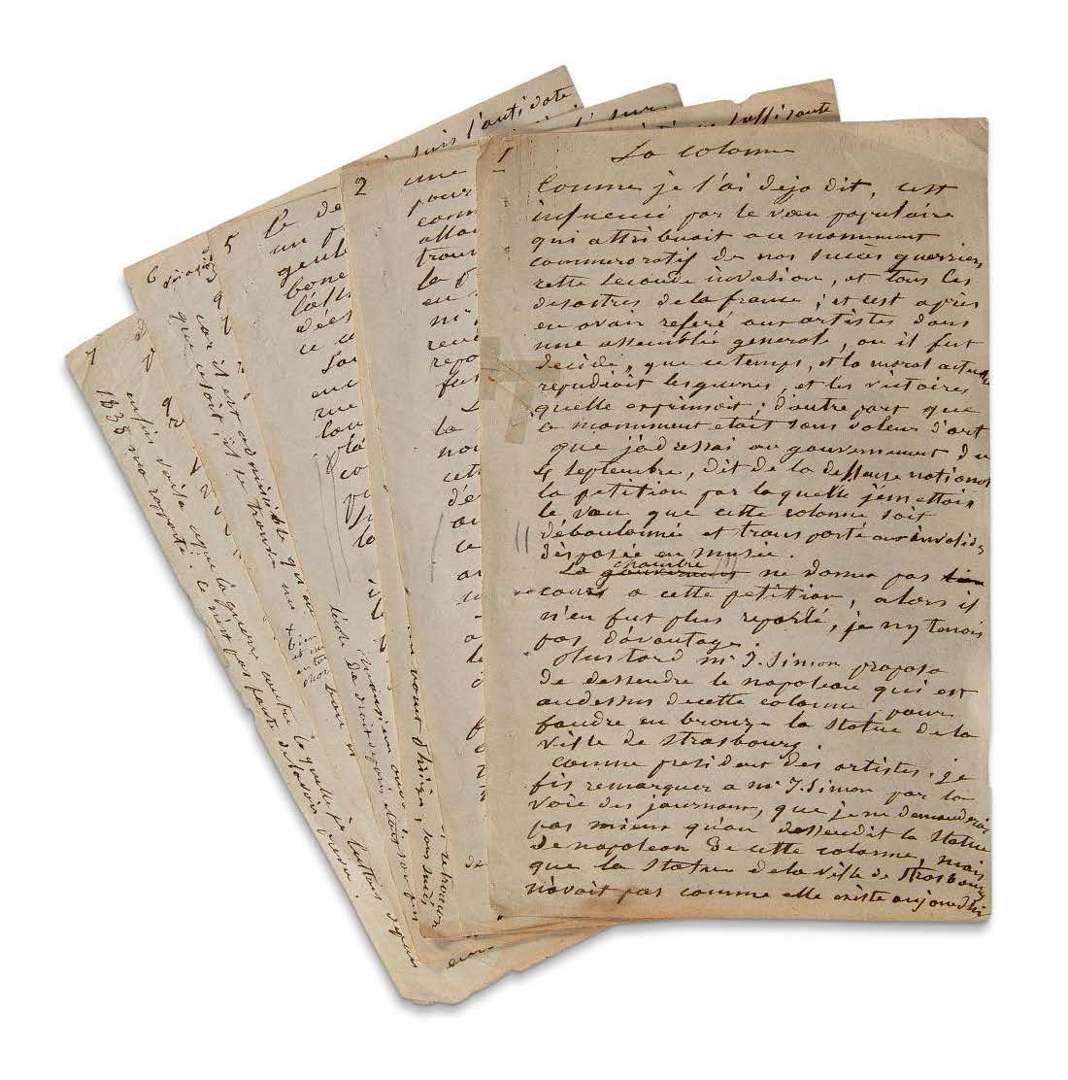 MANUSCRIT autographe, La colonne, [1871] | 7 pages in-8 très remplies d'une écriture serrée (petite fente marginale réparée au 1er feuillet).