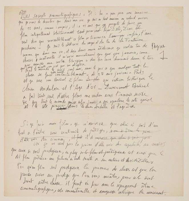 Texte paru en février 1954 sous le titre Mes secrets cinématographiques, dans le n° 14 de la revue La Parisienne, dans une adaptation de Michel Déon, qui a normalisé l'orthographe et la syntaxe aberrantes de Dali. Le manuscrit révèle l'oralité délirante du texte dalinien original, avec d'importantes variantes | il est rédigé dans une langue singulière, émaillée d'hispanismes et reproduisant phonétiquement l'accent catalan.