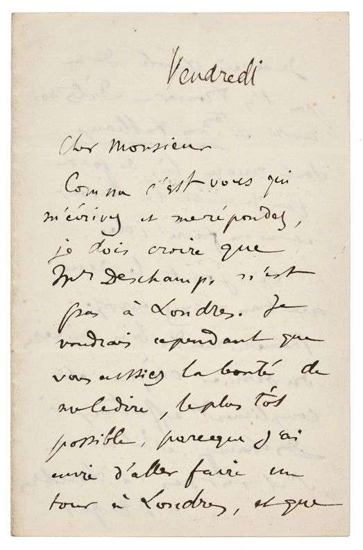 Il le prie de lui dire si Deschamps est à Londres, «le plus tôt possible, parce que j'ai envie d'aller faire un tour à Londres, et que je serais désolé de ne pas l'y trouver. - Dites-moi aussi si tous mes tableaux sont encore là, de façon que je puisse les revoir et m'en faire une idée»...