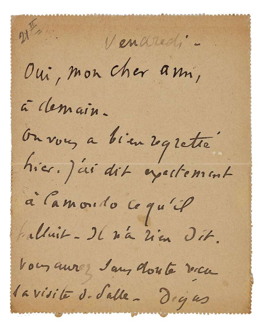 L.A.S. «Degas», Vendredi [26 mai 1893], au sculpteur Albert BARTHOLOMÉ | 1 page in-12, adresse (carte-lettre).