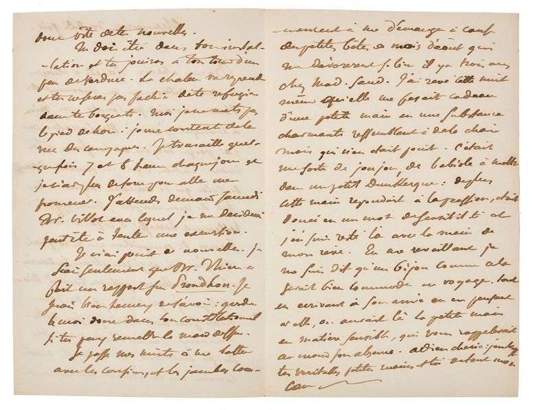 Il raconte un rêve étrange où figurait George SAND : «elle me fesait cadeau d'une petite main en une substance charmante ressemblant à de la chair mais qui n'en était point. C'était une sorte de babiole à mettre dans un petit Dunkerque [célèbre magasin de frivolités] | de plus cette main répondait à la pression, était douée en un mot de sensibilité [...] En me réveillant je me suis dit qu'un bijou comme cela serait bien commode en voyage. Tout en écrivant à son amie ou en pensant à elle, on aurait là la petite main en matière sensible. [...] Adieu chérie j'embrasse tes véritables petites mains et toi de tout mon coeur»...