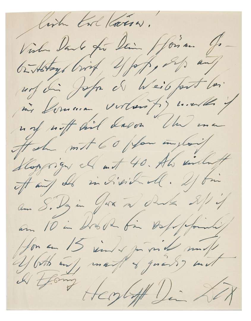 L.A.S. «Dix», {1951], à Karl KRÖNER | 1 page petit in-4 | en allemand. [Comme Otto Dix, le peintre allemand Karl KRÖNER (1887 - 1972) avait suivi à Dresde, avant la Première Guerre mondiale, des cours à l'École des Arts décoratifs puis à l'École des Beaux-Arts. Influencé par Cézanne, il peignit des fleurs, des paysages et des portraits.] «Lieber Karl Kröner ! Vielen Dank fûr Dein schönen Geburstagsbrief, Ich hoffe, dass auch noch die Jahre der Weisseit bei mir kommen, verlaufig merke ich noch nicht viel davon weil man ist aber mit 60 schon umgleich Klappriger als mit 40. Als vielleicht ist auch dass individuell. Ich bin am 8.Dez. in Gera und denke dass ich am 10. in Dresden bin, wahrscheinlich schon am 15 wieder zurück muss. Ich bitte auch, macht es gnädig mit der Ehrung»...