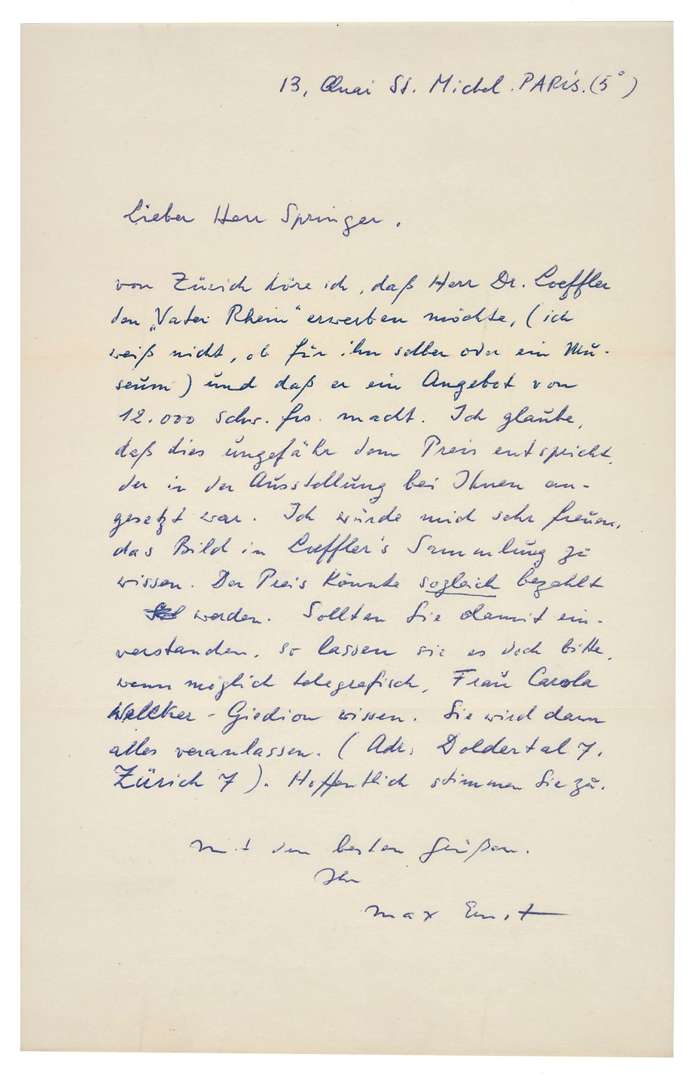 Il a appris par Zurich que le Dr LOEFFLER voulait acheter Vater Rhein (il ne sait si c'est pour lui-même ou pour un musée), et qu'il a fait une offre de 12.000 francs suisses. C'est à peu près le prix marqué dans l'exposition à la Galerie Springer. Ernst aimerait beaucoup savoir ce tableau dans la collection Loeffler...