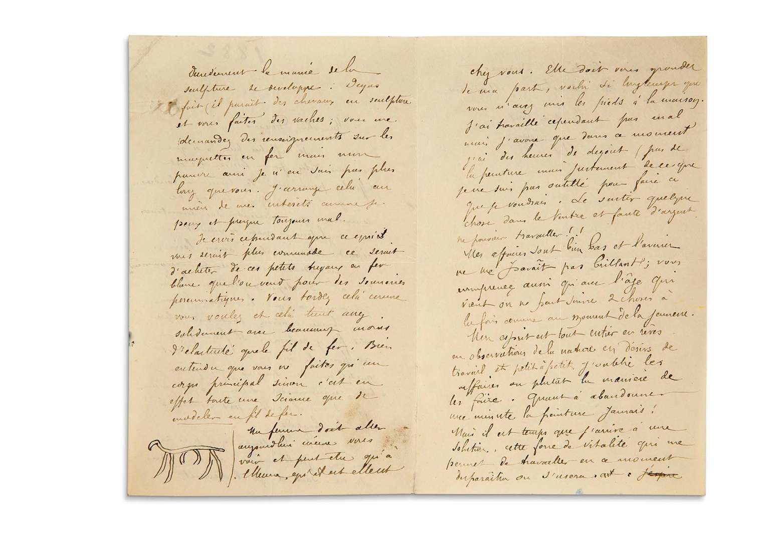 Belle lettre à Pissarro sur sa vocation de peintre, avec dessin à la plume d'une armature de sculpture de cheval.
