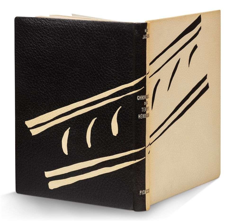 Chronique des temps héroïques. Illustré par Pablo Picasso. (Paris, Louis Broder, [1956]) | in-8, rel. maroquin crème pour le plat sup., et noir pour le plat inf., avec motifs picassiens mosaïqués noir/crème, doublures avec grand motif mosaïqué en contraste de maroquin noir/crème, gardes de papier verni, dos lisse titré noir/blanc, non rogné, couverture illustrée et dos conservés, chemise demi-maroquin à rabats, étui bordé (Françoise Lévy-Bauer).