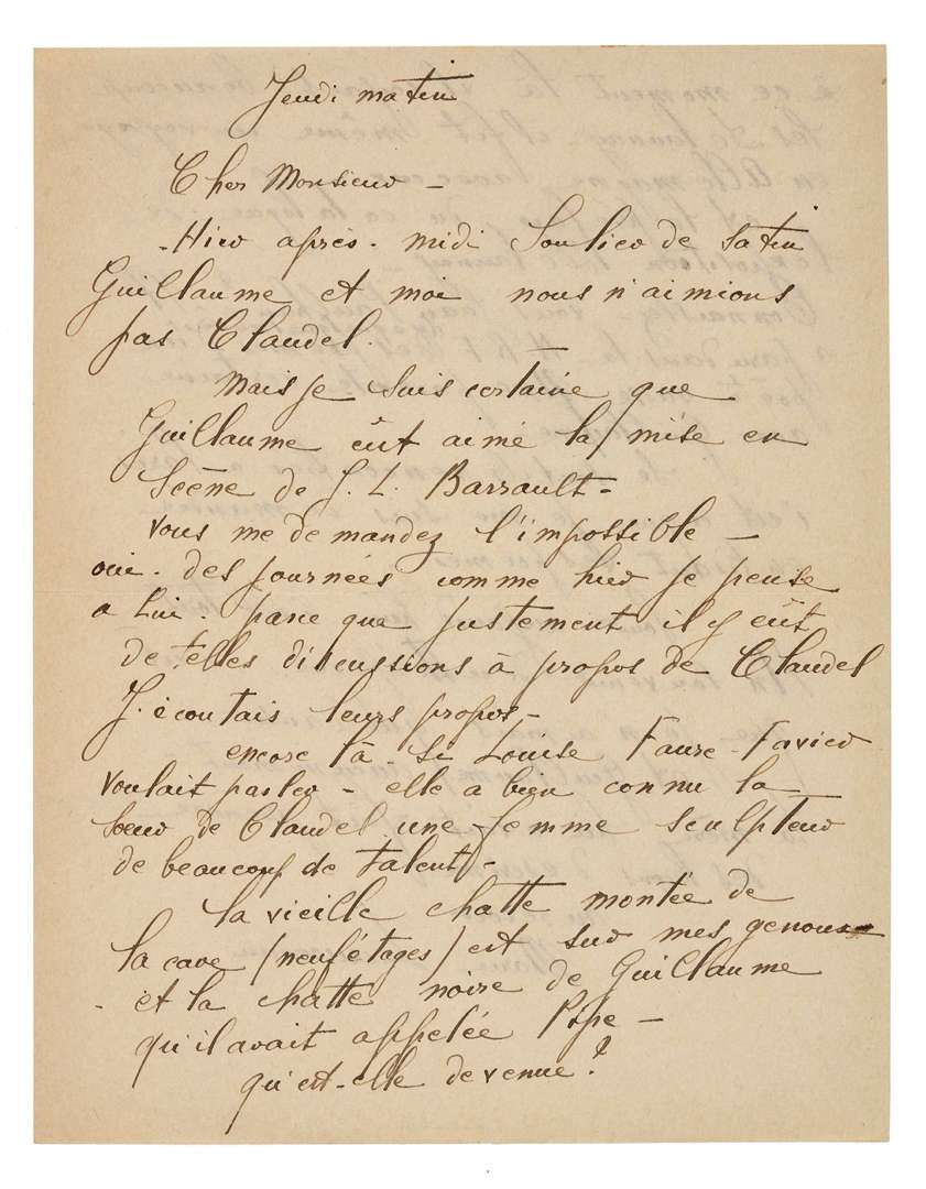 Belle lettre de souvenirs sur Guillaume Apollinaire. «Hier après-midi Soulier de satin. Guillaume et moi nous n'aimions pas CLAUDEL. Mais je suis certaine que Guillaume eût aimé la mise en scène de J.L. Barrault. Vous me demandez l'impossible - oui. Des journées comme hier je pense à lui, parce que justement il y eût de telles discussions à propos de Claudel. J'écoutais leurs propos.