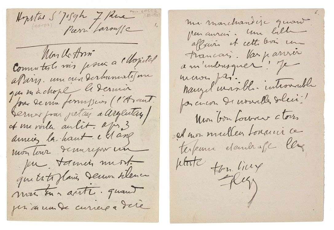 Amusante lettre sur son séjour à l'hôpital. [Léger a été hospitalisé après avoir échappé à une attaque de gaz moutarde à Verdun.] «Comme tu le vois je suis à l'Hôpital à Paris. Une cure du rhumatisme qui m'a chopé le dernier jour de ma permission (l'avant-dernier jour j'étais à Argentan) et me voilà au lit. Après 3 années là-haut c'est assez mon tour de me reposer un peu». Il explique son silence : «Quand je n'ai rien de curieux à dire je ne dis rien. [...] Je pense traîner ici 3 semaines un mois au moins ? Je suis chez les soeurs de St Vincent de Paul. Hôpital tout à fait chic. Je garde le lit naturellement j'ai les reins en compote. C'est rigolo un hôpital je ne connaissais pas. “Harmonie en blanc” c'est froid et silencieux un petit geste fait du bruit tout le monde regarde. Un rien, un souffle prend des proportions énormes. C'est absolument à rebours du Front. Ici tout est minutie il faut éviter une goutte d'eau par terre. La soeur la verrait ! Je suis dans le pavillon Ste Geneviève soigné par soeur Ste Cécile qui matin et soir récite la grande prière auquel il faut répondre. [...] En face de moi j'ai “petit nègre” c'est classique il doit y en avoir un comme ça dans chaque pavillon. Ça fait très bien. C'est la seule “tache noire” de l'endroit. Petit nègre et moi sommes déjà des amis, et voilà pourquoi : il doit prendre du champagne ! Il n'aime pas du tout cela, ça gratte il m'a dit. Alors il me le donne à boire. C'est comme cela qu'on a fait connaissance ! [...] je cherche à me débrouiller pour quitter mon colier de misère. [...] J'ai un marchand de tableaux tout prêt à m'acheter ma marchandise quand j'en aurai. Une belle affaire et cette fois un Français. Vais-je arriver à m'embusquer ? Je ne crois pas»...