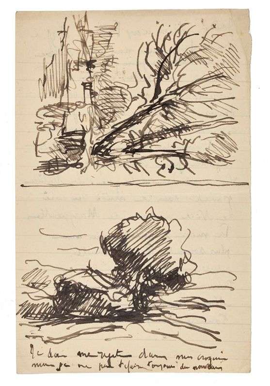 L.A. S. «Luce» avec 2 DESSINS au dos, Jeudi, à SON FILS Frédéric | 2 pages in-8. «Mon vieux Frederic il y a bien longtemps que nous n'avons eu de tes nouvelles [...] Je travaille toujours». Il a vu LEBASQUE. «Les MATISSE partent dans le Midi du côté de Nice» ...