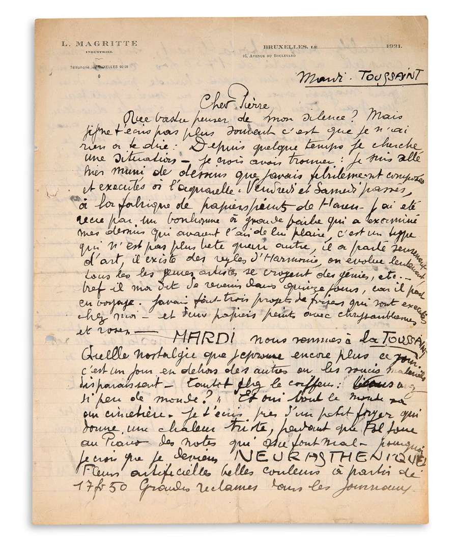 L.A.S. «René» avec dessin, Bruxelles Mardi Toussaint [1er novembre 1921], à Pierre-Louis FLOUQUET | 2 pages in-4, à en-tête de son père L. Magritte Industriel (trous de classur).