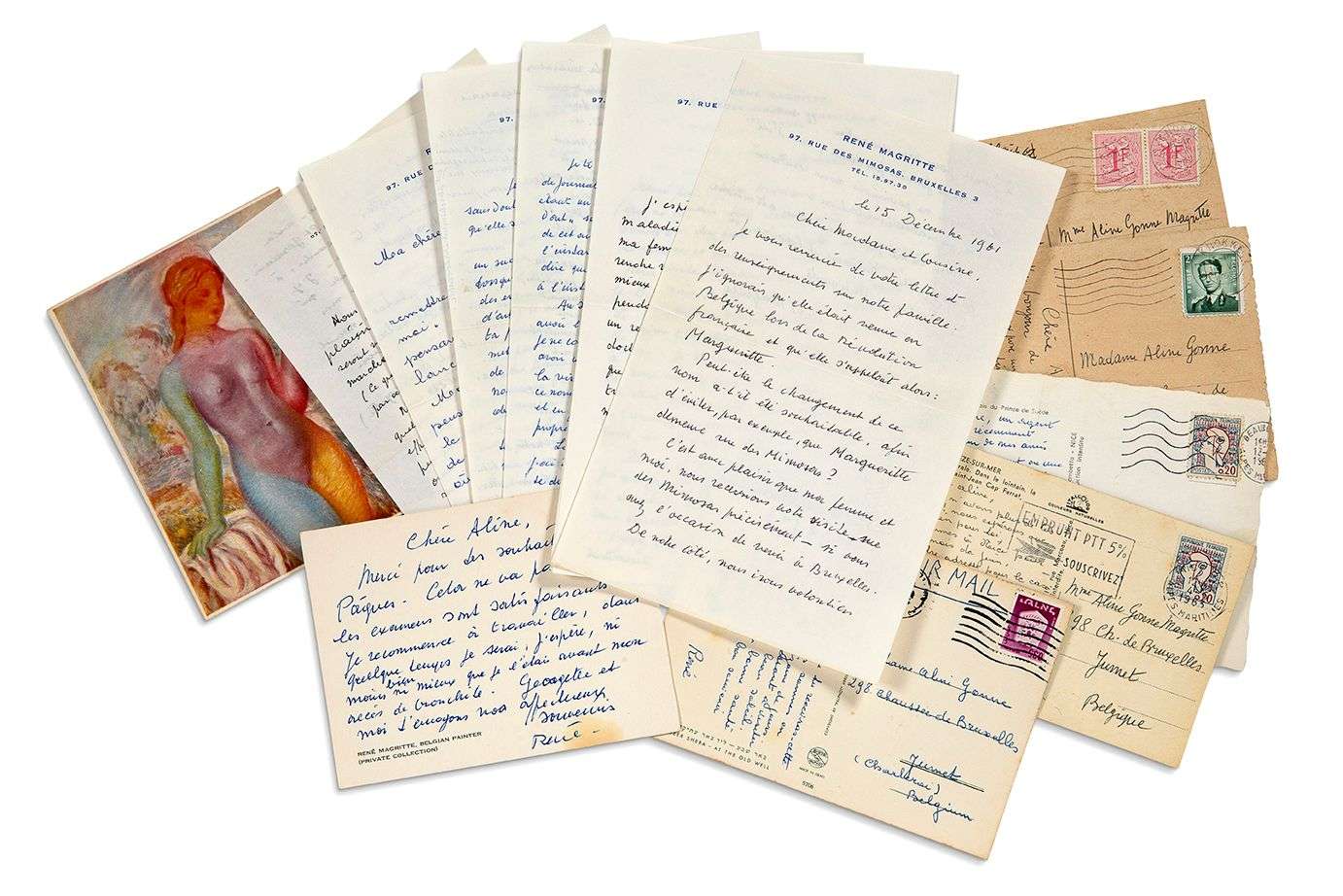 11 L.A.S. «René Magritte» puis «René», Bruxelles 1961 - 1964, à Aline GONNE à Jumet | 12 pages in-8 à son en-tête et 4 cartes postales.