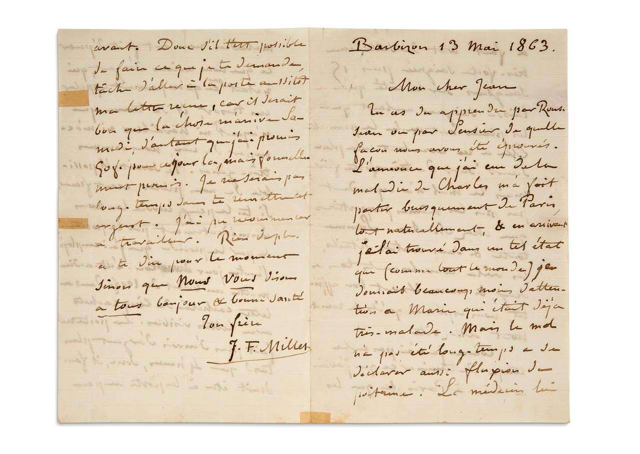 L.A.S. «J.F. Millet», Barbizon 13 mai 1863, à son frère Jean | 4 pages in-8 (quelques légères fentes réparées).