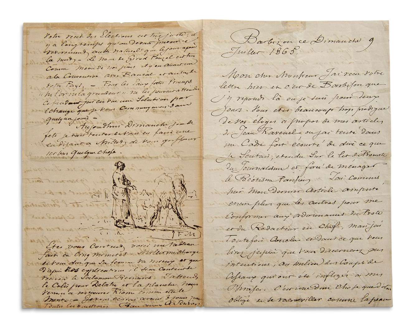 DESSIN original à la plume, signé «J.F.M.», sur une L.A.S. d'Alfred SENSIER, 9 juillet 1865 | 4 pages in-8 (traces d'encadrement et réparations).