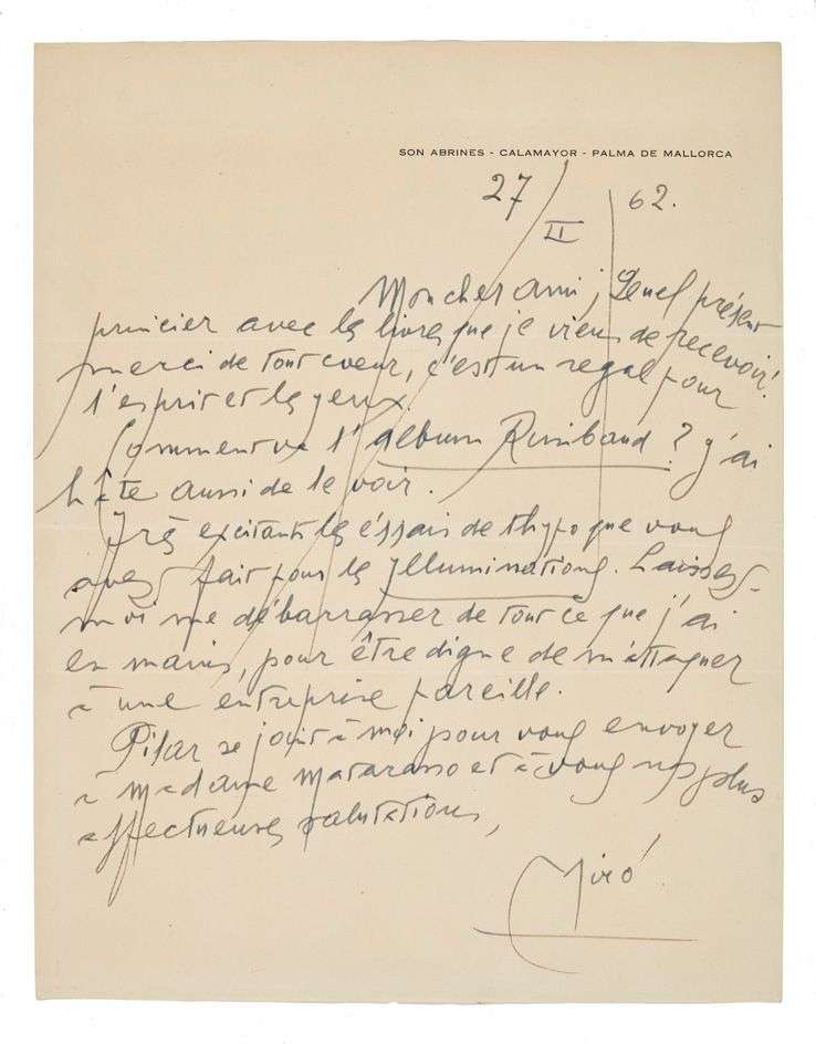 L.A.S. «Miró», Palma de Mallorca 27.II.1962, à Henri MATARASSO | 1 page in-4 à son adresse.