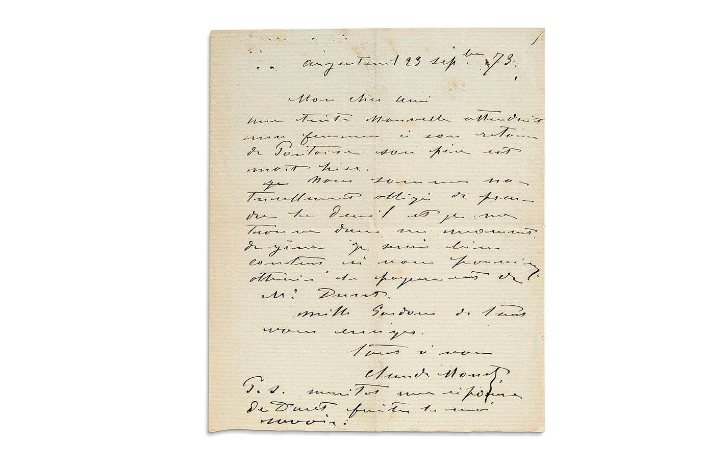 L.A.S. «Claude Monet», Argenteuil 23 septembre 1873, à Camille PISSARRO | 1 page in-8.