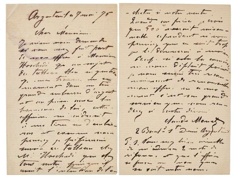 L.A.S. «Claude Monet», Argenteuil 7 mai 1875, à Paul DURAND-RUEL | 2 pages in-8 sur papier fin (légère mouillure).