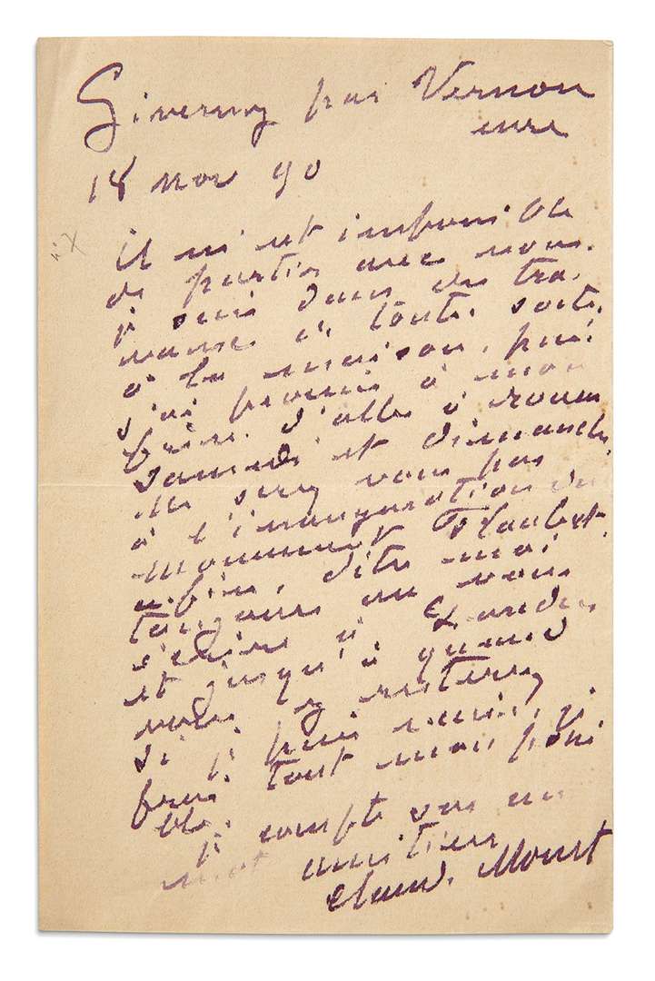 L.A.S. «Claude Monet», Giverny 18 novembre 1890, à Gustave GEFFROY | 1 page in-8 (montée sur carte), enveloppe (photographie jointe).