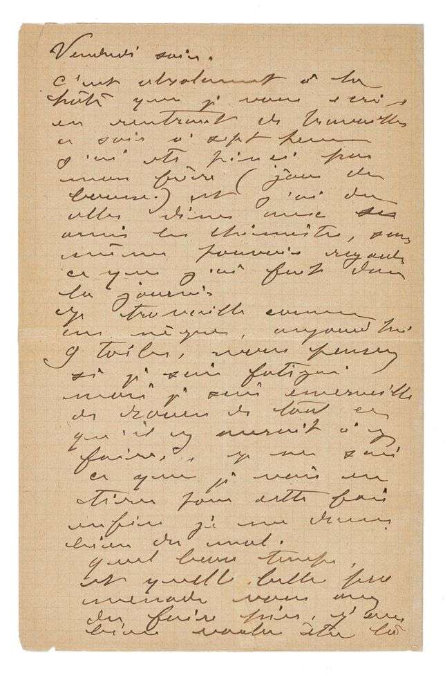 Vendredi soir. Il rentre de travailler à sept heures du soir. «J'ai été pincé par mon frère», qui l'a emmené dîner, «san même pouvoir regarder ce que j'ai fait dans la journée. Je travaille comme un nègre, aujourd'hui 9 toiles, vous pensez si je suis fatigué mais je suis émerveillé de Rouen de tout ce qu'il y aurait à y faire. Je ne sais ce que je vais en tirer pour cette fois enfin je me donne bien du mal. Quel beau temps et quelle belle promenade vous avez dû faire hier, j'aurais bien voulu être là [...] J'espère que mes plantes vont bien». Il ne sait quand il reviendra : «je trouverais imprudent de quitter le travail avec ce beau temps»...