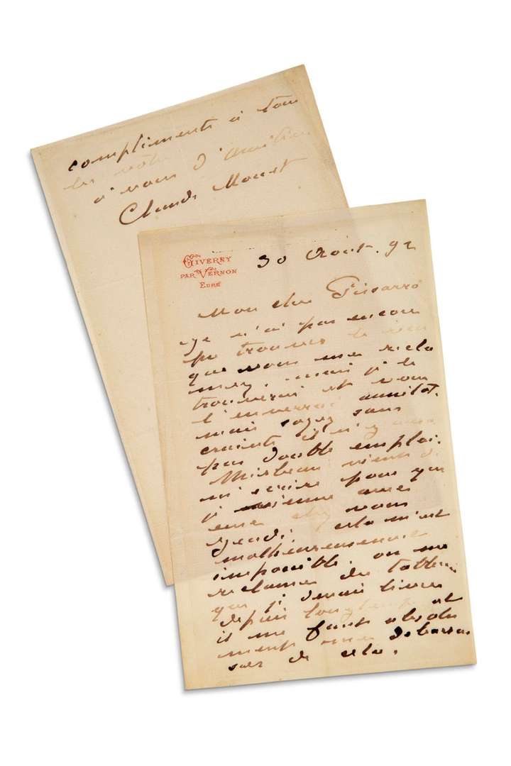 L.A.S. «Claude Monet», Giverny 30 août 1892, à Camille PISSARRO | 1 page et quart in-8 (photographie jointe). «Je n'ai pu pas encore pu trouver le reçu que vous me réclamez, mais je le trouverai et vous l'enverrai aussitôt. Mais soyez sans crainte il n'y a pas double emploi. MIRBEAU vient de m'écrire pour que je vienne avec eux chez vous Jeudi. Cela m'est malheureusement impossible. On me réclame des tableaux que je devais livrer depuis longtemps et il me faut absolument me débarrasser de cela»...