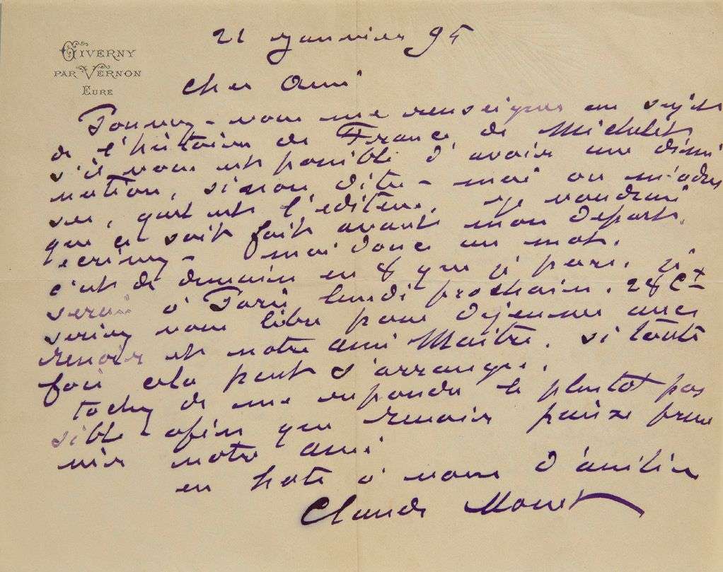 L.A.S. «Claude Monet», Giverny 21 janvier 1895, à Gustave GEFFROY | 1 page oblong petit in-4, enveloppe.