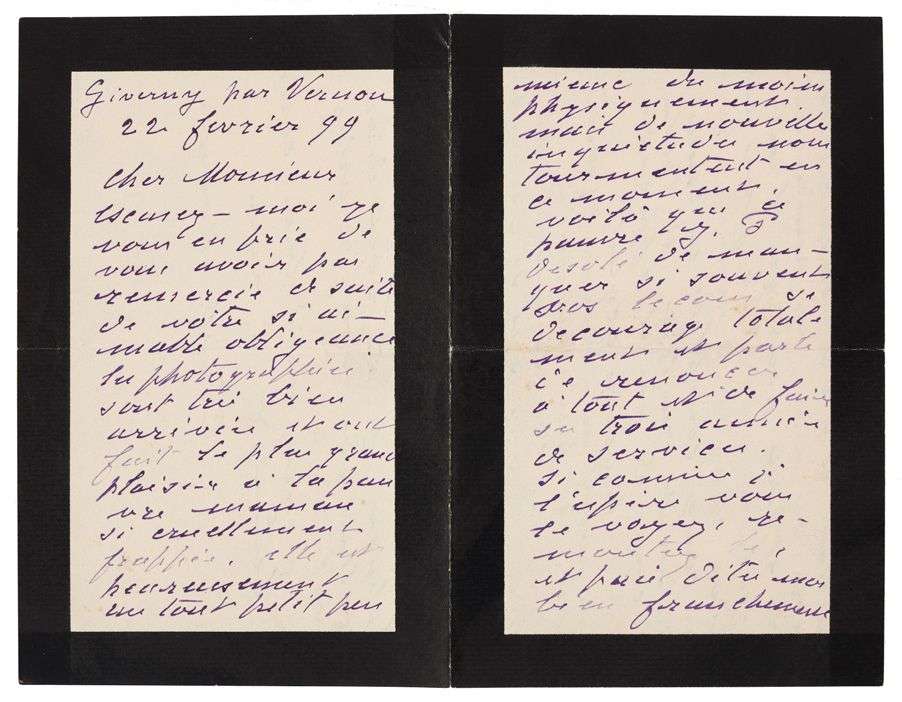 L.A.S. «Claude Monet», Giverny 22 février 1899 | 4 pages in-8 (papier deuil).